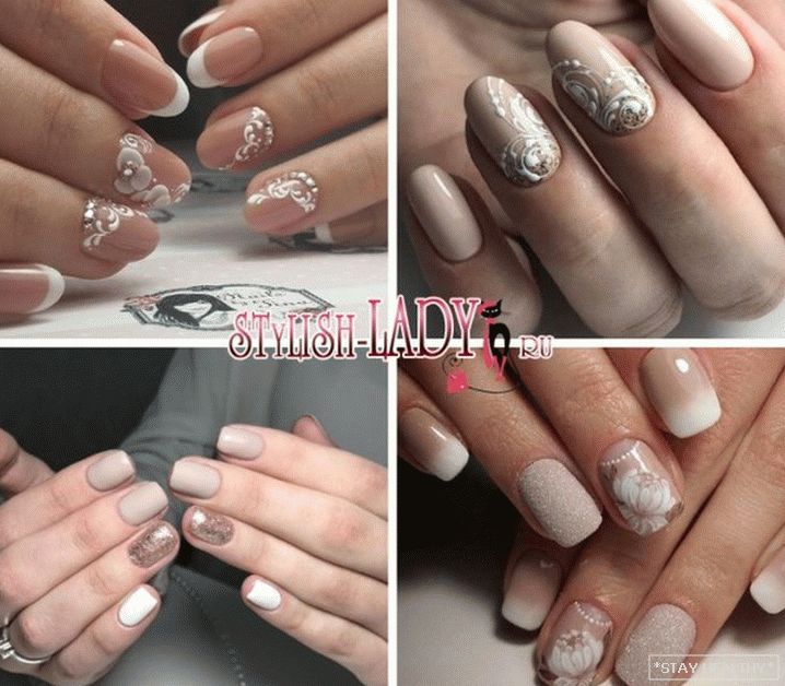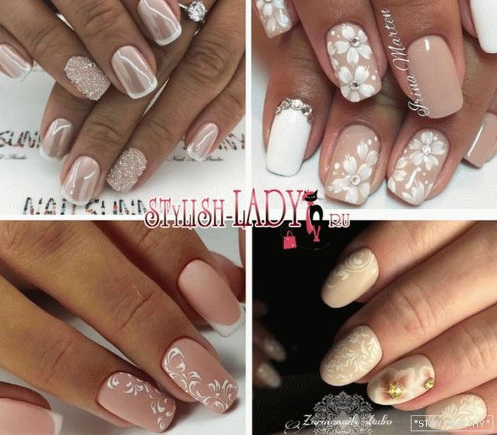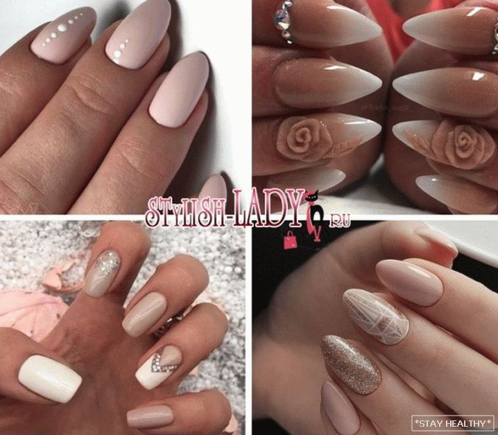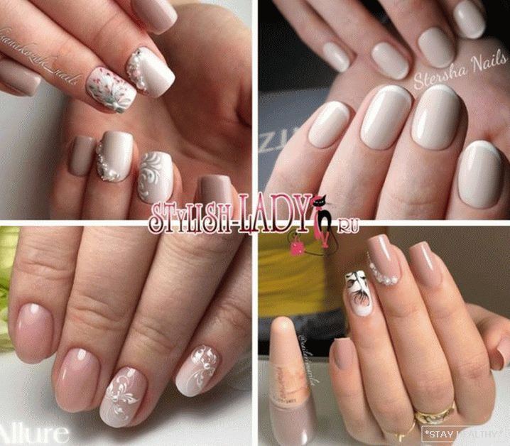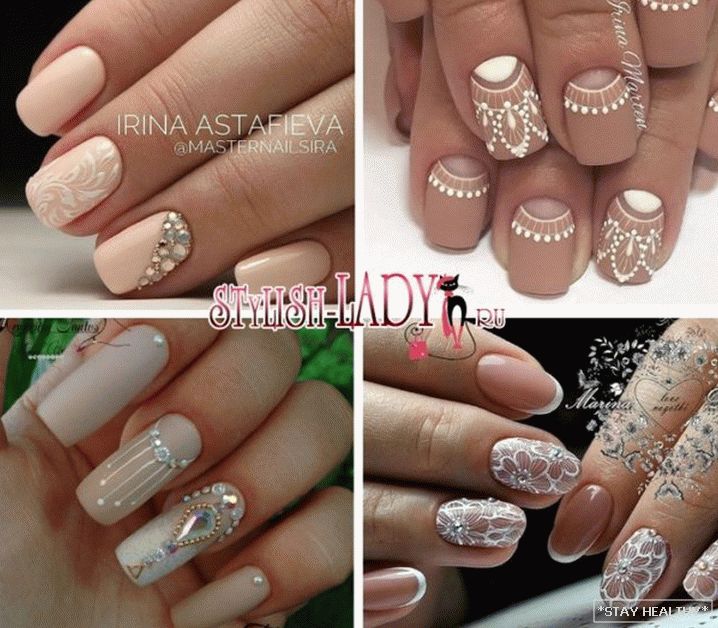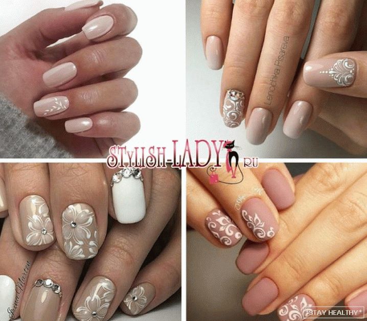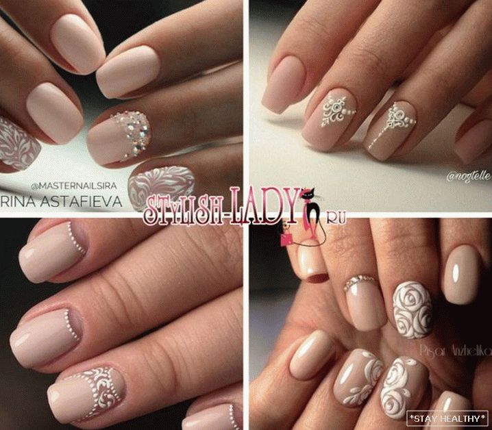 розныя надпісы або сімвалы; - манікюр з лепкай з акрылавай пудры. на бежевой основе хорошо