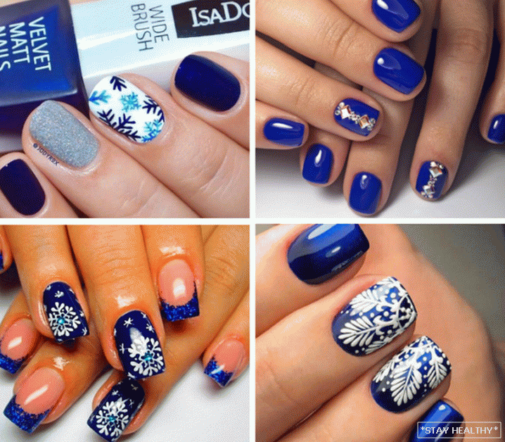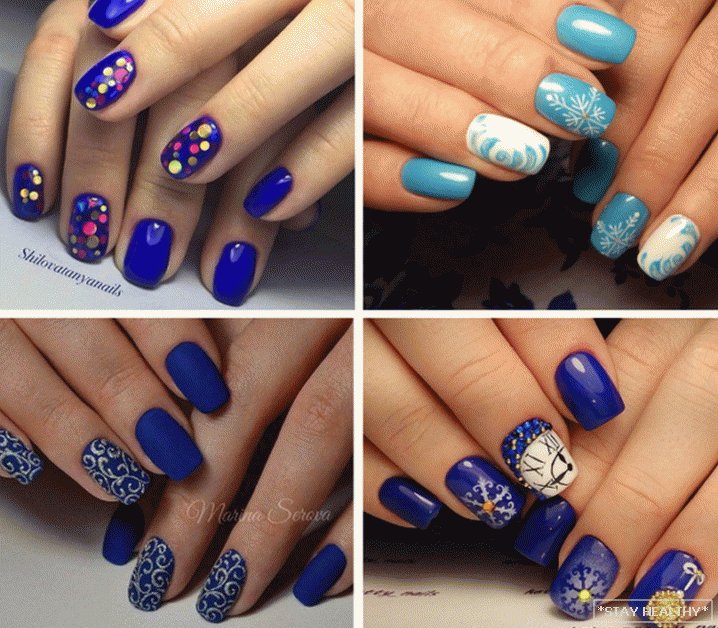 Навагодні манікюр ў сініх тонах на кароткія пазногці