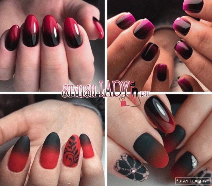 Градыентныя манікюр, выкананы ў чырвоных танах можа ўключаць
