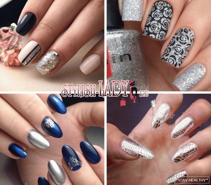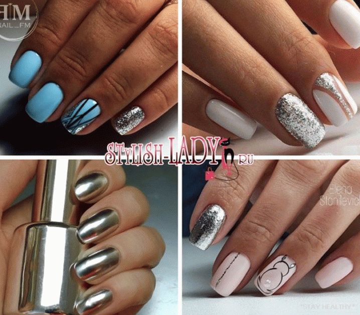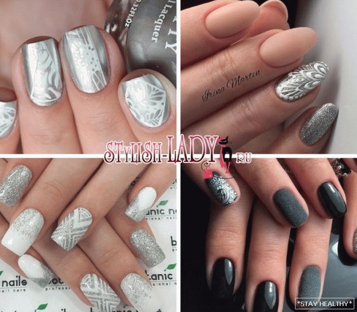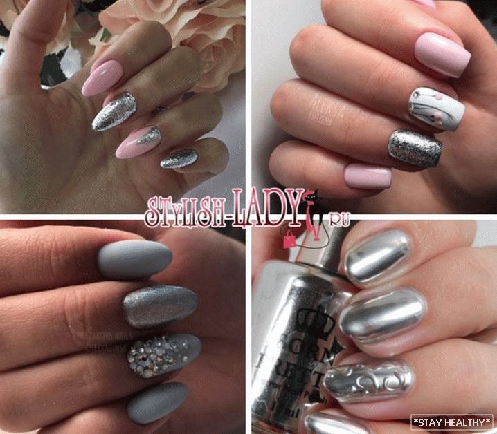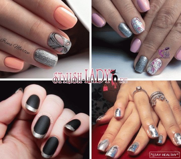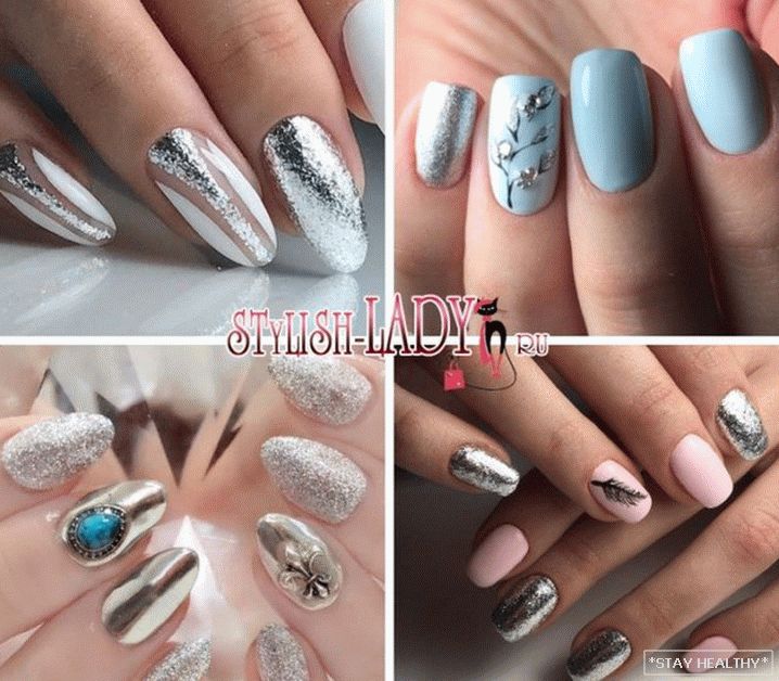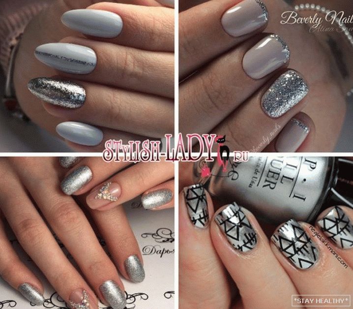 Розныя варыянты манікюру ў серабрыстых тонах