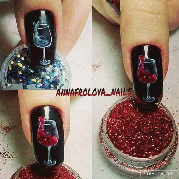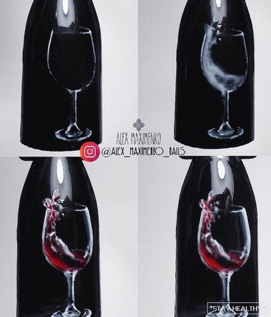 Глядзіцца такі асіметрычны манікюр вельмі арыгінальна. - Бутэлька віна і келіх. Маляваць келіх віна і бутэльку можна на