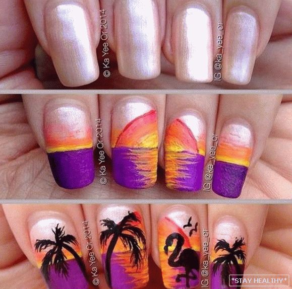 - напрыклад, на адным пазногці маляваліся пальму, падсветленыя пяшчотным
