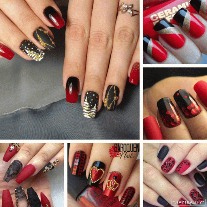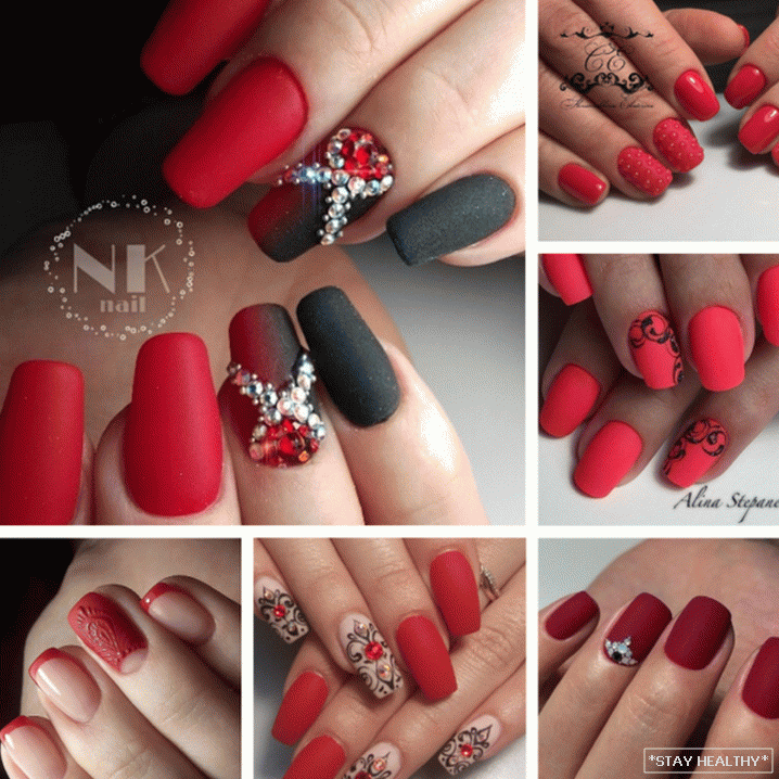 манікюру з’яўляецца спалучэнне чырвонага матавага і чорнага глянцавага