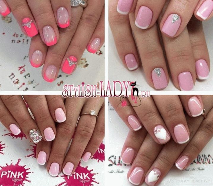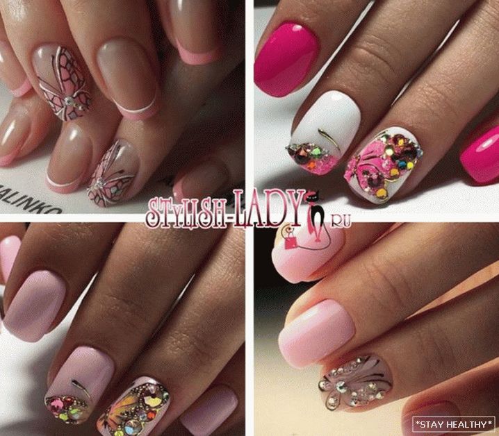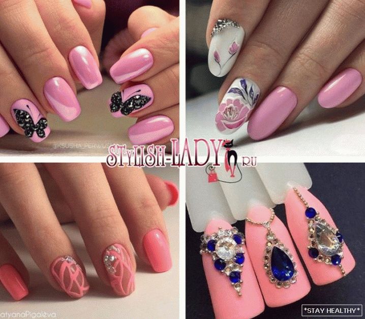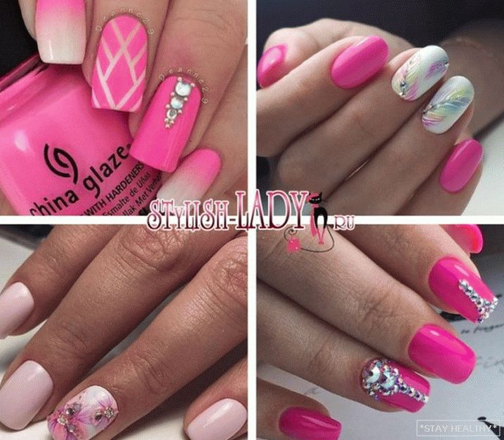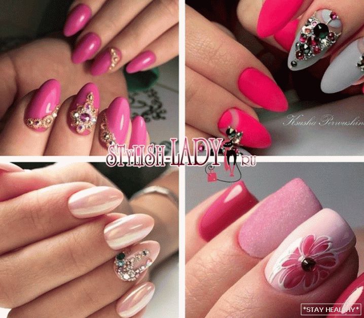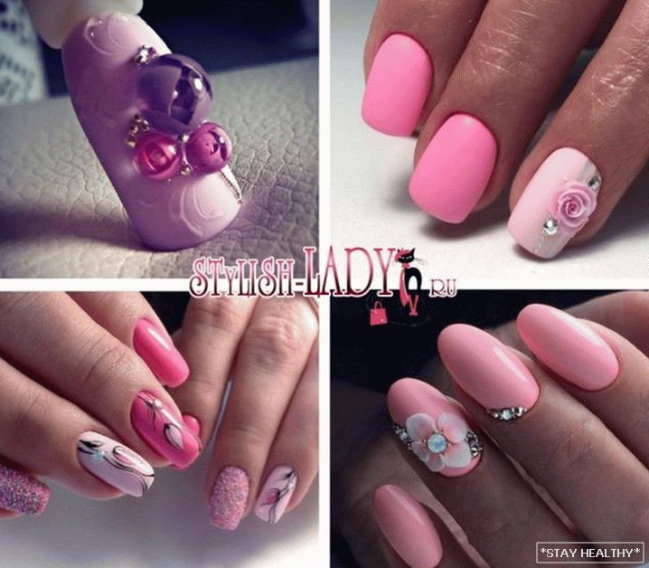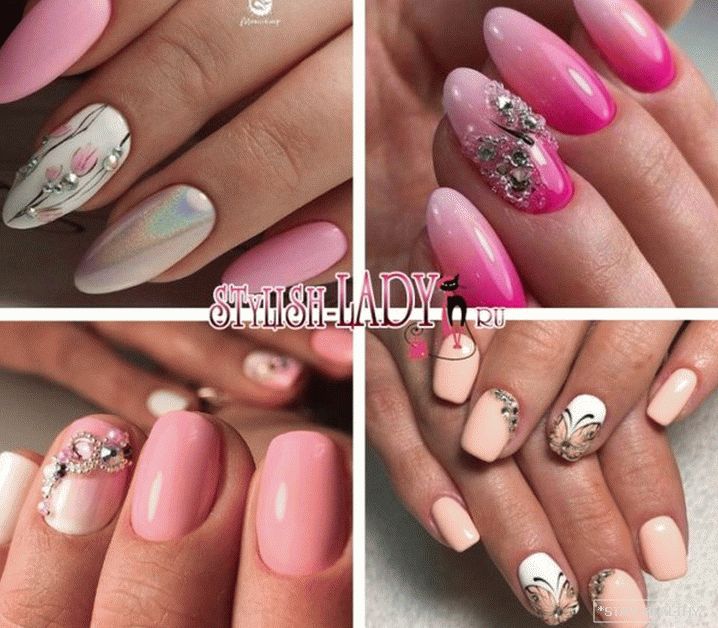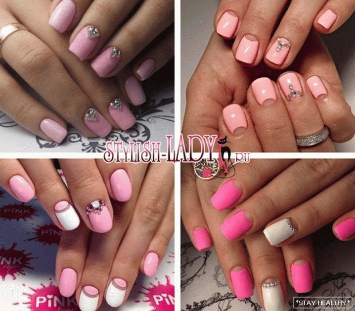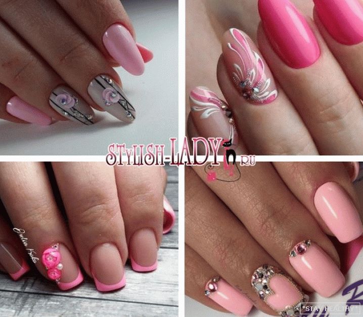 таго ж ружовыя пазногці выдатна спалучаюцца са стразамі. Пры гэтым