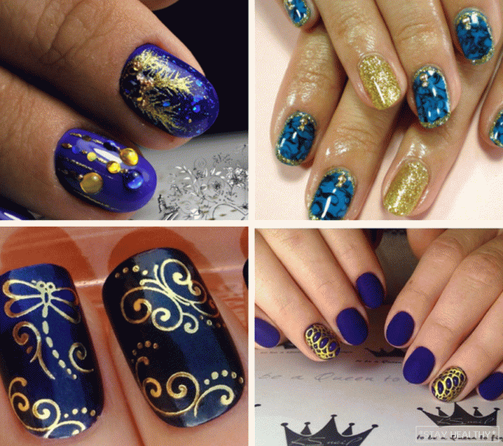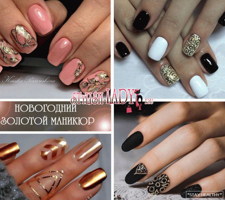 - Навагодні манікюр з залатымі бліскаўкамі і стразамі